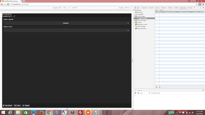 localStorage item. This item will be an array of all the days in that month, and each item in the array will be an object consisting of the expenditure entered for each category ("A", "B", "C" and "D"). Confused? Not to worry, sit tight and allow me to demonstrate. I'm going to create the function